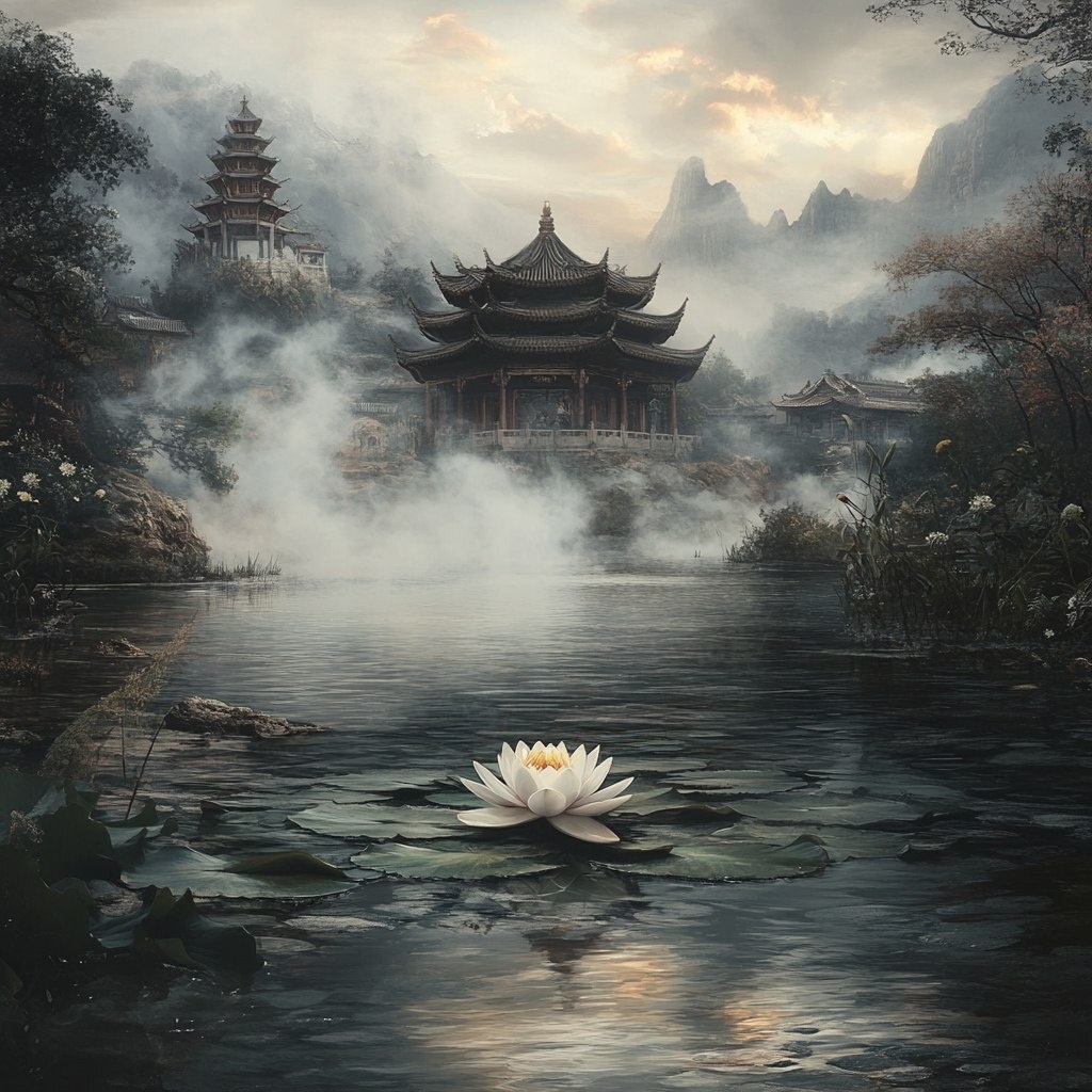 Создано на основе запроса: a river with a chinese pavillion in the background and water lily in the center, smoke and mist around