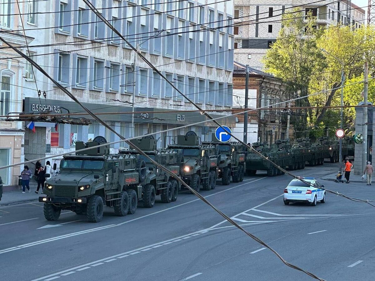 На площади Карла Маркса в Ростове выстроилась колонна военной техники — машины ждут выезда на репетицию парада в честь Дня Победы, сообщают