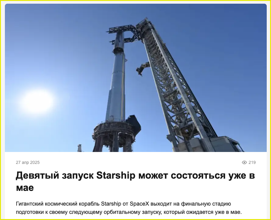 На следующий день , 7 марта 2025 г., в статье про 8-й полёт "Старшипа"