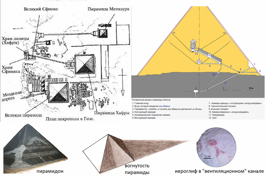 Комплекс Великих пирамид в Гизе один из наиболее древних, интересных и известных. Он включает в себя три пирамиды, скульптуру Сфинкса, а также нескольких храмов. Официально принятым временем постройки Большой пирамиды Хеопса (Неопса, Хуфу) считается 2560 г. до н.э. как усыпальница фараона. Тем не менее, пирамиды Гизы сильно отличаются от всех других египетских пирамид. Большая пирамида обладает такими уникальными особенностями, как верхние ходы, камеры, ниши, шахты и Большая галерея. Сразу после постройки Великая пирамида была облицована белыми известняковыми плитами, отражавшими солнечные лучи, а её вершину венчал пирамидон (гранитное навершие). Вогнутость одной из граней пирамиды составлявшая метр при отполированности граней была заметна визуально – пирамида отражала солнечный свет и буквально сияла (вообще, «pyra» греческое слово, обозначающее огонь созвучно слову пирамида).