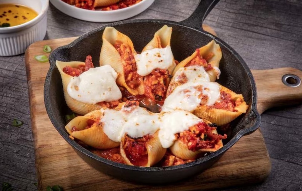 Смажьте дно жаропрочной формы соусом. Наполните ракушки оставшейся смесью и выложите в жаростойкую форму, посыпьте сыром моцарелла. Накройте форму крышкой, поставьте в духовку, предварительно разогретую до 180 градусов, и запекайте около 20 минут.