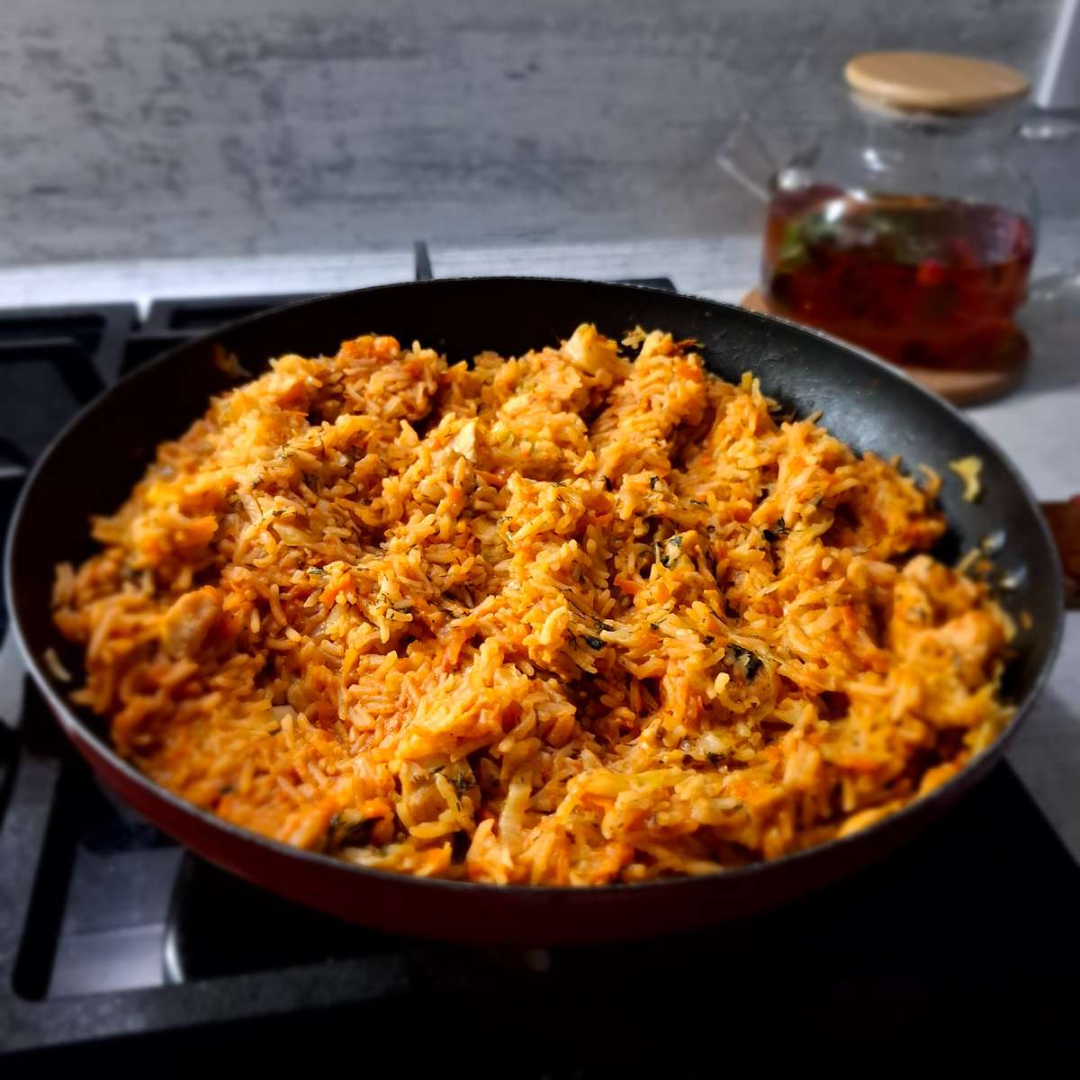 - Смешивание: В сковороду добавьте куриную грудку, обжаривайте до готовности. Затем добавьте отваренный рис и томатную пасту. Перемешайте.