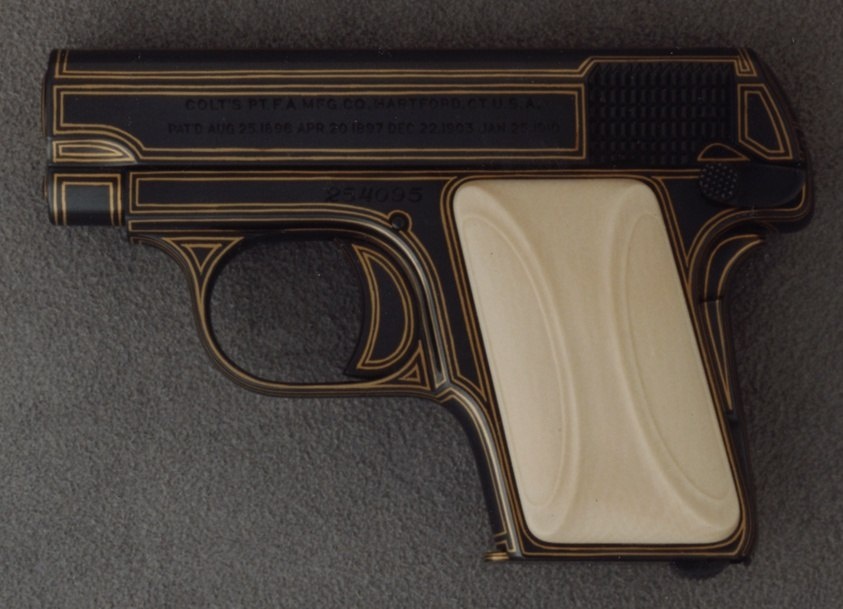 Изящное орудие убийства. Ладно, это мы просто для красного словца так написали. Доподлинно неизвестно, стреляли ли из этого пистолета в людей. На фото из коллекции Чикагского института искусств показана роспись эпохи ар-деко, выполненная на карманном оружии марки «Кольт» (Colt Model 1908 Vest Pocket). Оформление было сделано художником Реймондом Дж. Вельгусом в 1929 году.