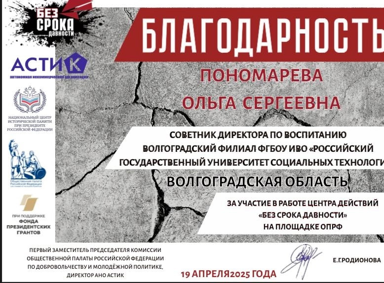 В знак признания ценного вклада в сохранение исторической памяти и активное участие в проекте «Без срока давности», Ольгу Сергеевну Пономареву удостоили письмом благодарности.