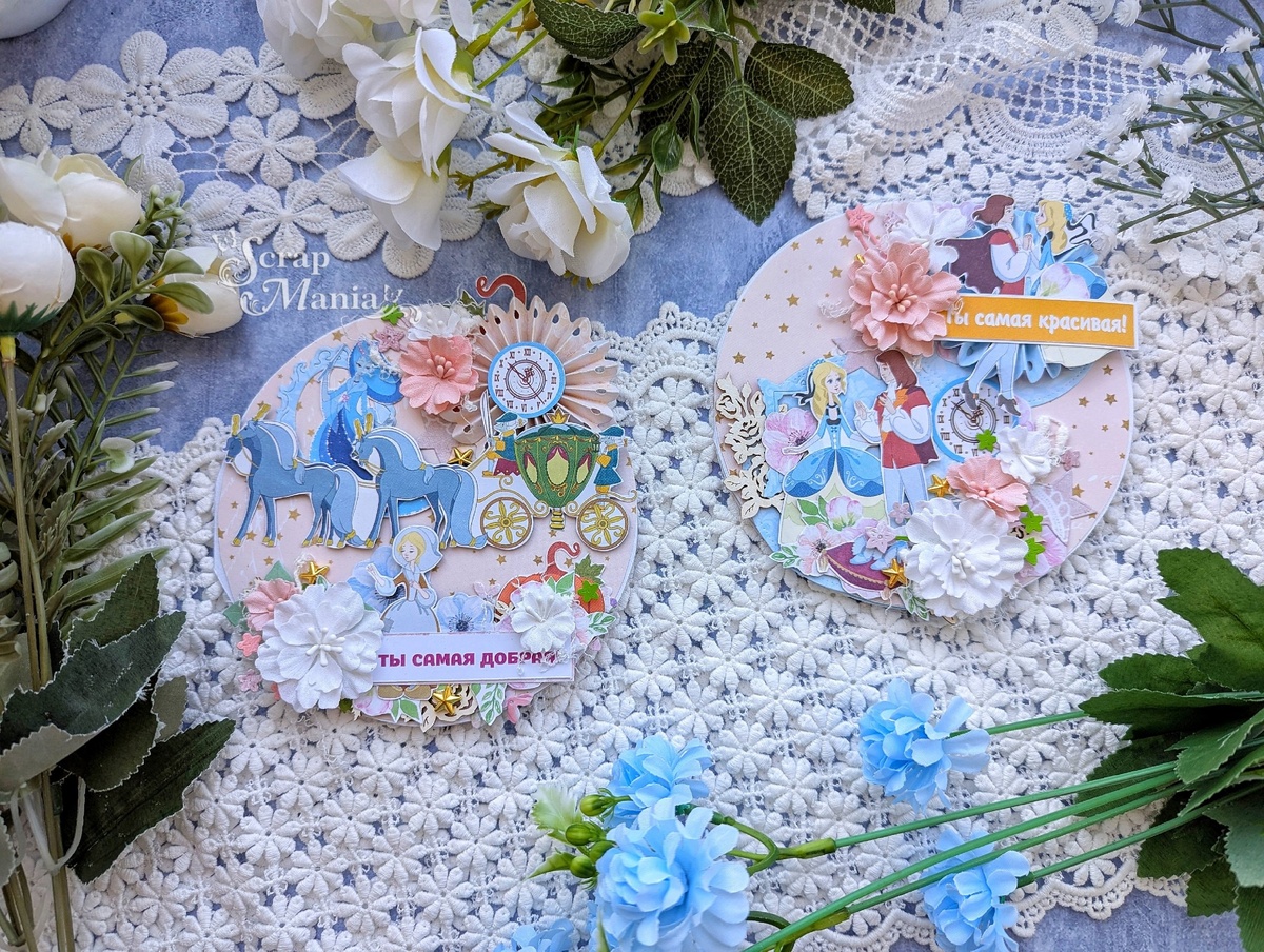 Вся информация по проекту находится в теме в группе вКонтакте, там же можете задавать интересующие вас вопросы. Всем привет, с вами Гредасова Катрин. Вот и пришло время последнего, четвертого этапа нашего задорного Мути-Пульти СП "Поделись улыбкою своей!". Этот этап называется "Ведь кто же, кроме тебя, звезды-то считать будет?!". Остановимся на ОЭ: звезды - у меня есть вырубка ножом "Звезды" и нежный цветочный чипборд "МурТильда. Розочки". Оба ОЭ присутствуют на обеих открытках, созданных на основе потрясающего набора бумаги А5 для вырезания "Золушка". Помогает мне в создании фона еще одна замечательная коллекция "Принцесса на горошине". Открытки я решила сделать круглой формы, диаметром примерно 14 см, именно круглая форма вызывает у меня ощущение нежности и ранимости. представляет собой сцену, когда фея-крестная преображает нашу Золушку. На ней я разместила надпись "Ты самая добрая", взятая со скрап-карты А4 "Надписи на открытки для самой лучшей девочки". ОЭ видны на открытке сразу