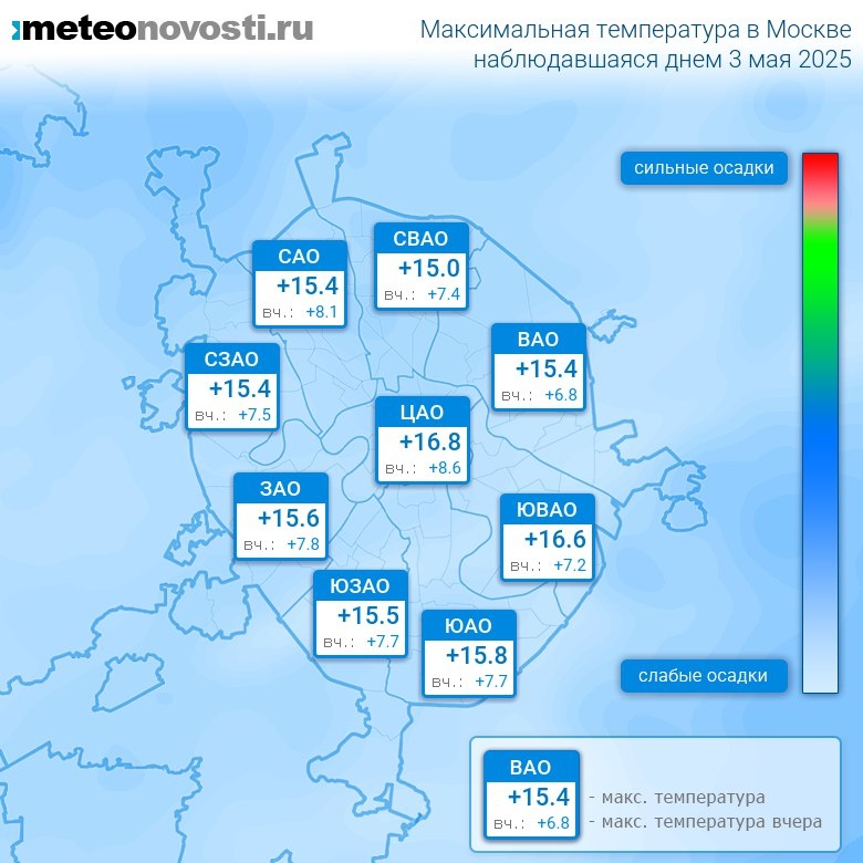 #за12часов #день Прошедший день 3 мая был на 7.8°C теплее вчерашнего. Максимальная температура днём в Москве оказалась на 2.3°C ниже нормы, что в пределах обычных значений. Самая высокая температура +16.8°C была зафиксирована в 18 часов в центре города, а холоднее всего было на востоке: +12.1°C. Разница по максимальной температуре в разных частях столицы составила за день целых 4.7°C. Максимальные порывы ветра днём достигали 7 м/с. Атмосферное давление за день понизилось с 741 до 739 мм.рт.ст. Осадков не наблюдалось. Самый теплый день в Москве 3 мая был в 1970 году, когда максимальная температура составила +27.2°C, а холодный в 1886 году: +2.1°C. Перейти на сайт Прогноз погоды на 14 дней