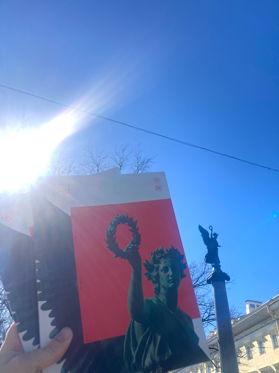 Вышел из печати 28 номер Дайжеста! Темой выпуска стал Триумф. Ещё раз убедился, что журнал окреп и усилился с появлением темы номера. Позволяет не просто давать издательскую подборку мероприятий, мест и героев, но пропускать это через призму рассуждений. Триумф — это и тематика Победы, военный триумф. Но ещё и триумф города, жизни, личности. Триумф архитекторов и зодчих, художников и артистов. В этом выпуске хотелось рассмотреть триумф как волю человека, как праздник и торжество — активное, позитивное и жизнеутверждающее. Уже вторую обложку номера для нас дизайнит крутейший Василий Бирюков — идеальное попадание в образ как журнала в целом, так и текущей темы. Сочетание минимализма и элементов искусства задают настроение журналу и, думаю, становятся отличительной чертой Дайжеста, чему я крайне рад. Сфотографировал для нас скульптуру Ники — Даниил Жердев. Профессионально и молниеносно найдя идеальный свет в те три секунды, когда в Петербурге было солнечно за пару дней до сдачи номера в п