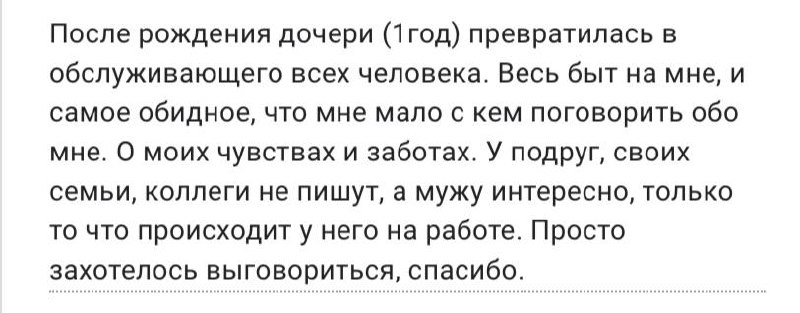 #вопрос_анонимка Это не просто выговориться - это сигнал, что вам сейчас очень нужна поддержка. И я его слышу. Очень ✨ Материнство в первый год - непростое испытание. Особенно, если рядом нет тех, кто понимает, с кем можно разделить. Ваша боль понятна. Когда быт становится непрекращающимся марафоном, а разговоры - только про работу мужа или детские подгузники, начинает стираться ощущение «я – живой человек». С чувствами. С потребностями. С правом быть услышанной. А ведь вы - не только мама, не только жена. Вы - женщина, которой нужно пространство для себя, даже если это просто 15 минут тишины. Или разговор, где можно сказать: «мне тяжело», и никто не перебьёт словами «а у меня на работе...», а обнимет, хотя бы словами, погладит и принесет теплого чаю. Давайте попробуем поискать, где вы можете запросить поддержку: 🤩Вы сами. Дайте себе право на «я». Не ждите, пока кто-то спросит. Начните с себя: «Сегодня я хочу почувствовать себя живой. Хотя бы чуть-чуть. Что мне поможет?» Может