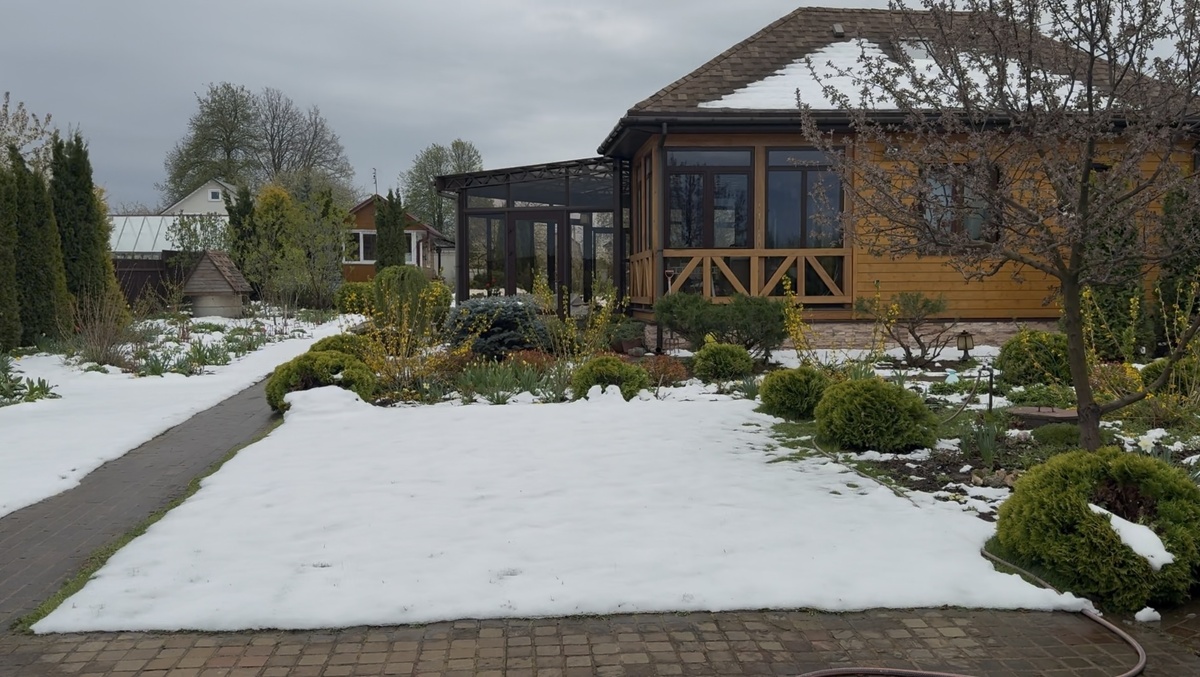 Фото автора Сад находится на севере Московской области. Обычно в деревне хорошо слышны все звуки природы, но не сегодня. По всей деревне стоит гул генераторов, электричество пока у нас нет. Мне проще- приехала- уехала. За дом переживать не нужно - все-таки на улице весна, не замерзнет. Одно дело читать про стихийные бедствия и природные катаклизмы и совсем другое дело, когда все видишь своими глазами. Своими глазами сам катаклизм , который случился 1 мая , мне не пришлось увидеть, но последствия встретили меня сразу как только подъехала к саду. Входные клумбы украшают скальные можжевельники «Скайрокет». Парусность у них большая- пирамидальная крона очень пушистая и объемная. Растения взрослые - высота 4м, диаметр кроны в основании больше метра. Сильный ветер и снег не только накренили их, но и один из них справа разломали пополам. Возможно, если бы я была на месте стряхнула бы с них снег, но приехала только сегодня 3 мая. И снова их придется поправлять, натянуть веревки(наве