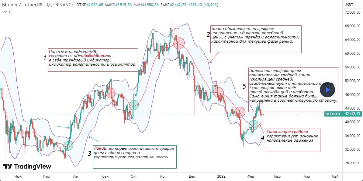 #Полосы Боллинджера. 🟢Практическое и простое применение в торговле. 🟢В сегодняшней обучающей статье хотела бы поговорить о полосах Боллинджера (BB). Данный индикатор является очень интересным в использовании, так как объединяет в себе трендовый индикатор, индикатор волатильности и осциллятор в одном. Я часто применяю его в аналитике, поэтому, хочу поделиться с вами его практическим применением. 🟢Дисклеймер: важно отметить, что я не считаю благоразумным использование лишь одного индикатора и в своей аналитике я использую комплекс разноплановых инструментов технического анализа, money management и психологию. Только совокупность РАЗНЫХ инструментов может сделать вашу торговлю успешной, ни один из индикаторов по отдельности не является Святым Граалем. 🟢Немного теории: Ленты Боллинджера являются линиями, прочерченными сквозь и вокруг структуры цены на графике. Их целью является дать относительные определения максимума и минимума; Цены вблизи верхней ленты являются максимумами, а ц