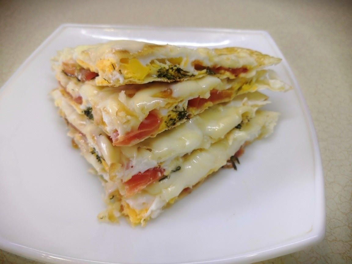 Разбиваем яйца, солим перчим и накрываем сверху вторым блином. Ждем-с пока схватится, переворачиваем и посыпаем сверху натертым сыром, ждем-с как растает.