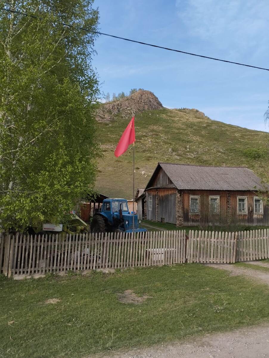 Вот на первом фото к этой статье от племянника Григория с родины и сопка наша видна хорошо, кстати, очень привычная моему глазу. Она же там сразу за огородом, и флаг красный, тоже мне привычный, но он современный. И совсем мне не понятно, почему его иногда стараются часто убрать со снимков и с разных мероприятий.