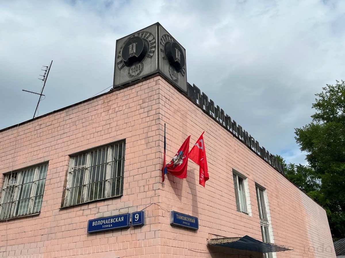 Трамвайный завод Флаги в честь годовщины Великой Победы на фасаде здания Трамвайно-ремонтного завода. Год постройки: 1975 г Адрес: Волочаевская улица, 9с11 Источник: архив lefortovo_today