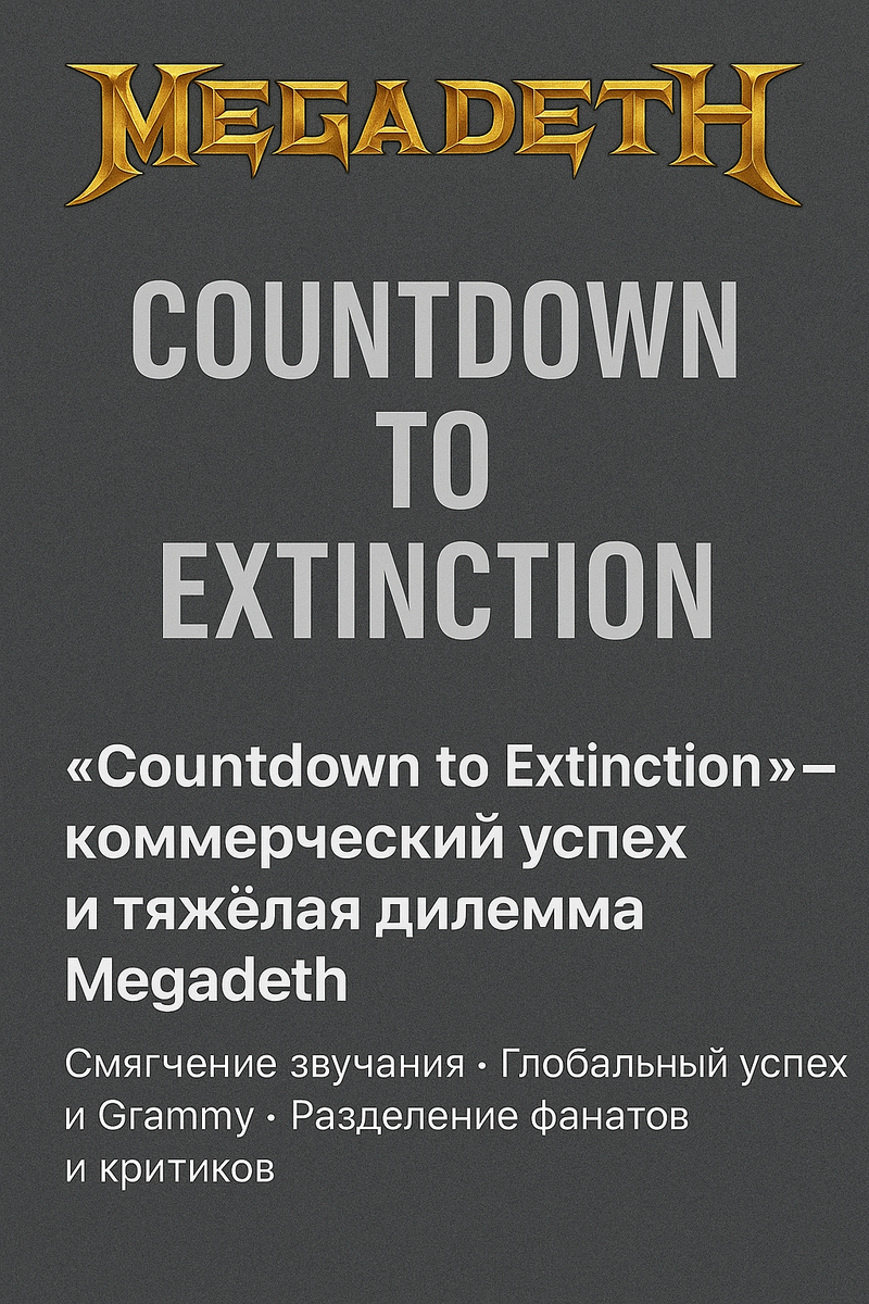 Год: 1992 | Альбом №5 🧨 Смягчение звучания: от ярости к расчёту Переход от рвущего мозг техно-трэша "Rust in Peace" к более доступному, «радиоформатному» звучанию в "Countdown to Extinction" — это был не случай, а холодный расчёт. Да, трэш не исчез, но стал подстриженным, причесанным, выдрессированным. Вместо бешеных 220 BPM — 130. Вместо звона по ушам — кач. Megadeth решили: теперь нас услышат все.