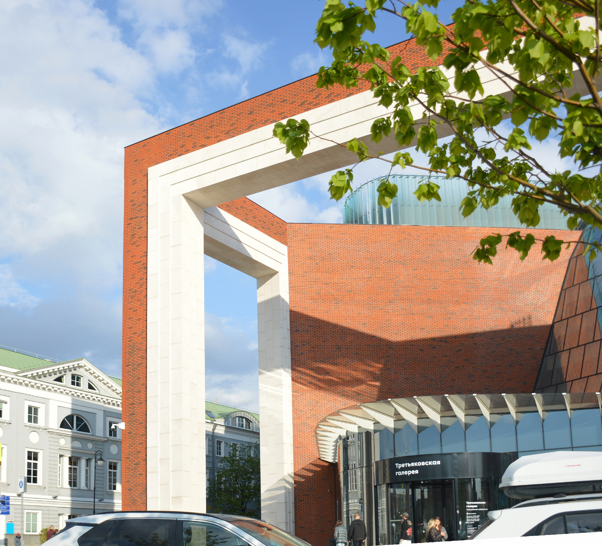 Видимо, в честь Международного дня Солнца, который мы отмечали 3 мая, и решило светило наше всё же нас навестить - это после ошеломительного ливня 1 мая и снегопада 2-го! Прогулка моя вышла недолгой - от Третьяковской галереи, нового корпуса на Кадашёвской набережной... ...и берегом Водоотводного канала, где весело били фонтаны: Среди водяных брызг блестели на солнце купола колокольни Ивана Великого и кремлёвских соборов - если приглядеться, можно заметить памятник Илье Ефимовичу Репину, что логично - стоит ведь напротив Третьяковской галереи: Лужков мост закрыт - готовятся к параду Победы на Красной площади... ...вдоль реки выстроились поливалки - в таком количестве вижу их впервые. Видимо, ночью отправятся отмывать Красную площадь... ...а уличного движения, между тем, почти нет - разве что такси снуют среди поливалок! Народ гуляет, радуются солнцу и люди, и собаки. Обратите внимание - у дамы с таксой на сумке брелок в виде таксы... Заглянем мимоходом в переулок! Там узорно-кружевна
