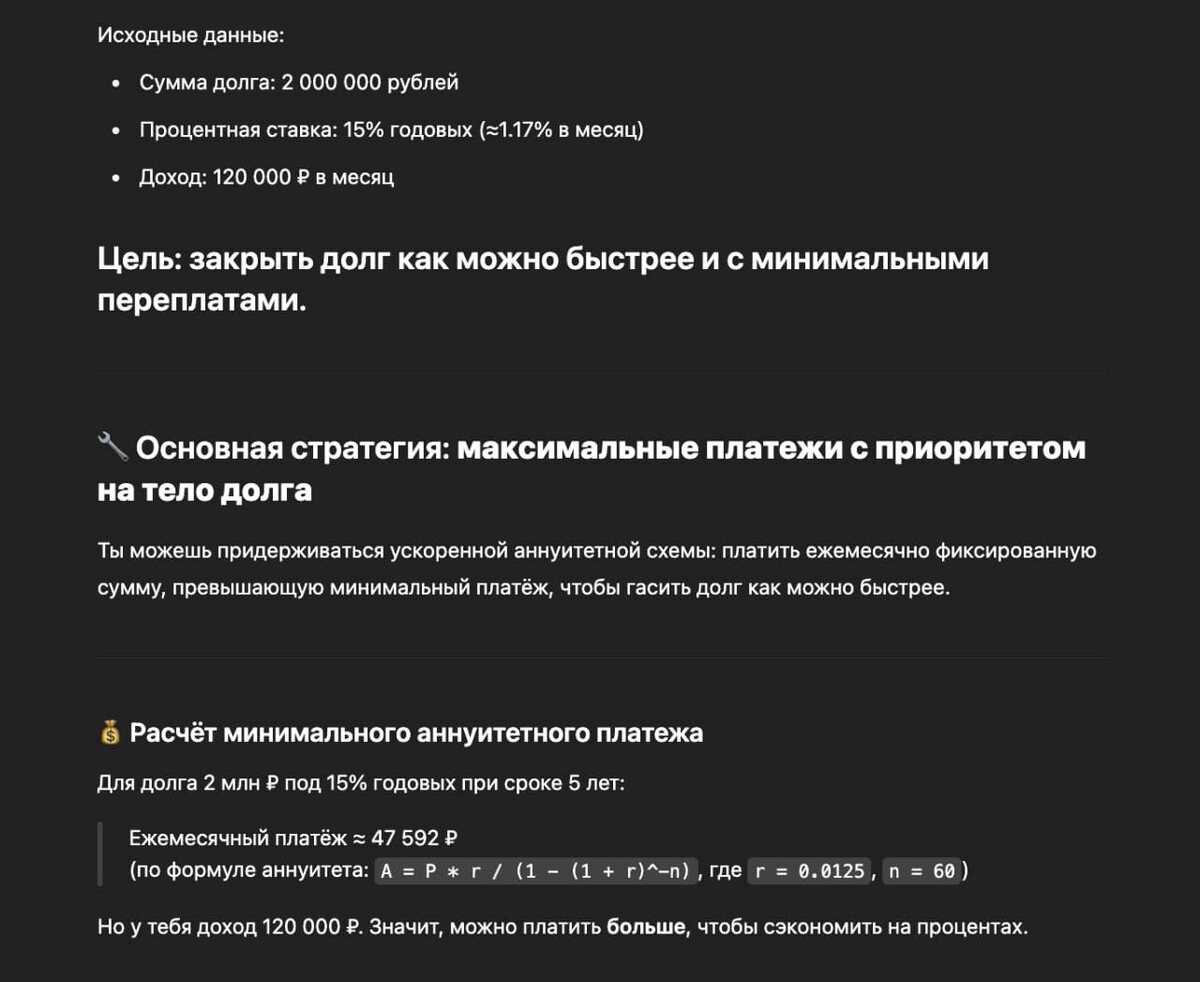 нашли 6 простых промтов, которые помогут выбраться из долговой ямы и вернуться к нормальной жизни. 1. План погашения долга под вашу ситуацию: Вот мои долги: [суммы и проценты]. Составь стратегию погашения, чтобы закрыть всё как можно быстрее и с минимальными переплатами. Мой ежемесячный доход [100 000 рублей]. 2. Где найти деньги на выплаты: Вот мои ежемесячные траты: [категории и суммы]. Покажи, где можно освободить деньги на оплату долгов без ощущения, что живешь в режиме жесткой экономии. 3. Как уменьшить процент по кредиту: Придумай сценарий разговора с банком: как убедительно попросить снизить ставку, какие аргументы использовать и как отвечать на отказы. 4. Дополнительный доход под ваш ритм: Вот мои навыки: [вставьте], и есть [кол-во часов] в неделю. Подбери 3 варианта подработки, которые реально впишутся в мой график и будут идти в счёт закрытия долгов. 5. Визуализация прогресса: Сделай систему отслеживания прогресса по выплатам: с этапами, мотивацией и ощущением, что я иду впер