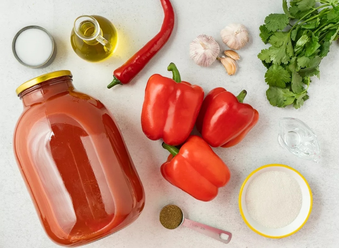Этот соус прекрасно подойдет для шашлыка. Жгучий перец и чеснок делают его острым, а кинза добавляет характерную пикантность, хорошо их оттеняя. Также заготовка подойдет для заправки солянки или харчо. Или для смазывания пиццы. Приготовьте острый томатный соус впрок и храните в темном прохладном месте. Мы взяли для приготовления томатный сок, но соус также можно сделать из свежих помидоров. Из указанного количества ингредиентов получается три банки соуса объемом 1 л каждая. Этот соус прекрасно подойдет для шашлыка. Жгучий перец и чеснок делают его острым, а кинза добавляет характерную пикантность, хорошо их оттеняя. Также заготовка подойдет для заправки солянки или харчо. Или для смазывания пиццы. Приготовьте острый томатный соус впрок и храните в темном прохладном месте. Мы взяли для приготовления томатный сок, но соус также можно сделать из свежих помидоров. Из указанного количества ингредиентов получается три банки соуса объемом 1 л каждая. Томатный сок 3 л = 3000 г Чеснок 100 г Кин