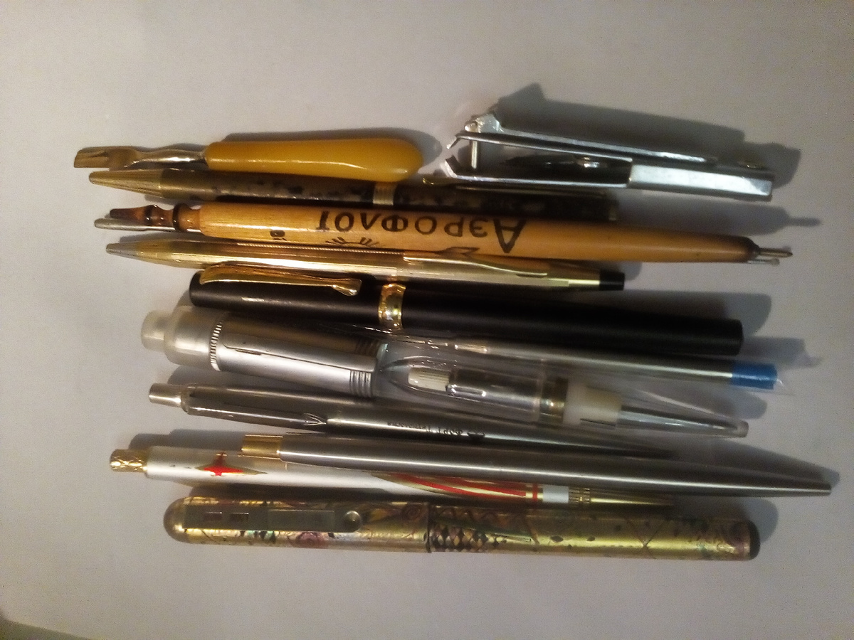 Предыстория... Продал с утра запонки из серебра... Чуть меньше, чем 100 р/грамм. Почему так дешево? Если бы я их продовал через комиссионку (2200 р/гр), мне бы приблизительно так и пришло... Это раз. А второе, там веса 10,6 грамм. Ну, округлил, 1000. А третье... У меня есть такие жа в собрании. А 1000 рублей - на дороге не валяются! Я только 500 находил. А 1000 ни разу. :0))) А еще продал ленинградскую брошку в эмалях. И вот что на полученные 1800 р. купил... КУпил кучку за 800. Там двк ручки (шариковые) Паркер. Они две - стоят по 400. Третья и четвертая снизу... Так что всё остальное в +. "Аэрофлот"... 130 рублей стоит? А под ним Кросс... США. Новую в и-те продают за 12 000 рублей. Короче, 800. Там - хороший слой позолоты... 500-й пробы. И - стержень пишущий оказался :0)) Вот еще покупка (тоже за 800) 1953 год... 34 рубля... Продавец сказал - от них коробочка... Странно: позолоты нет. Стёрлась? :0) И еще 200 р. Не знаю. что это... И продавец ( запон