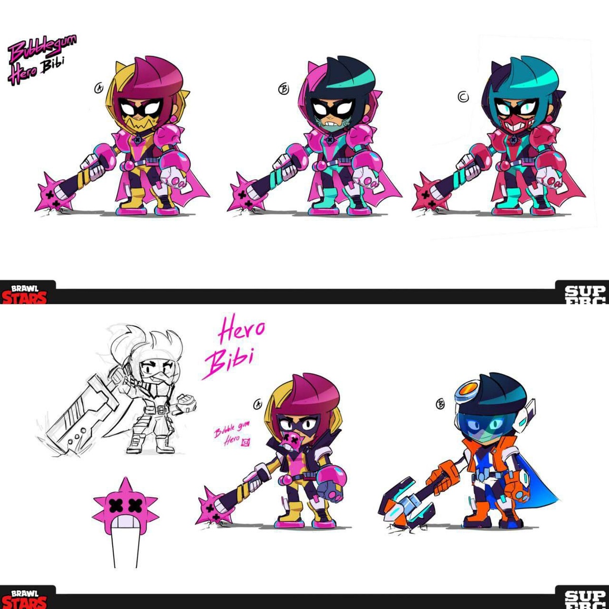 🔊 Ранние концепты на Безбашеную Биби Авторы скина нарисовали несколько вариаций, а также назвали его «Герой Биби» и «Жвачный Герой Биби». Мир Supercell. Подписаться