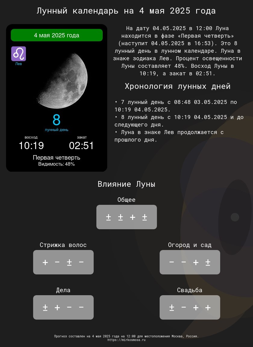 Лунные календари на 4 мая 2025 года: Подготовьтесь к этому дню с учетом влияния Луны! 🔹🌗 Лунный календарь на 4 мая 2025 года — Что приготовила Луна? Подробнее 🔹✂️ Лунный календарь стрижек на 4 мая 2025 года — Подходящий ли день для обновления прически? Подробнее 🔹🌱 Лунный календарь огородника и садовода на 4 мая 2025 года — Лучшее время для ухода за растениями. Подробнее 🔹📅 Лунный календарь дел на 4 мая 2025 года — Удачные моменты для важных задач. Подробнее 🔹💍 Лунный календарь свадеб на 4 мая 2025 года — Подходит ли этот день для вашего торжества? Подробнее