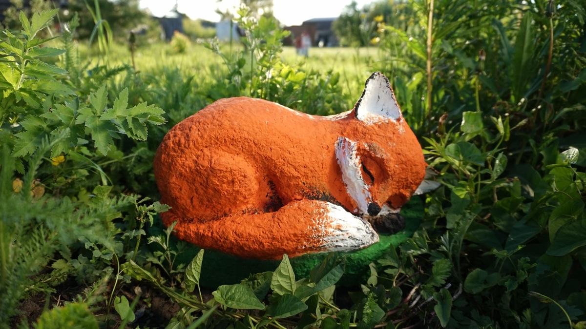 Можно, конечно, купить садовую фигурку в магазине, но я не ищу лёгких путей, и делаю свои поделки сама. Таких точно ни у кого нет! А как они здорово смотрятся в саду, вы только полюбуйтесь. Самая любимая фигурка - это спящий лисенок. Так уютно он пристроился под кустиком.