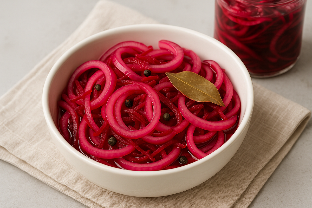 Дайте луку со свеклой полностью остыть при комнатной температуре, затем уберите в холодильник минимум на 2–3 часа. Лучше оставить на ночь — так вкус получится более насыщенным, а лук окрасится в красивый розово-бордовый цвет.