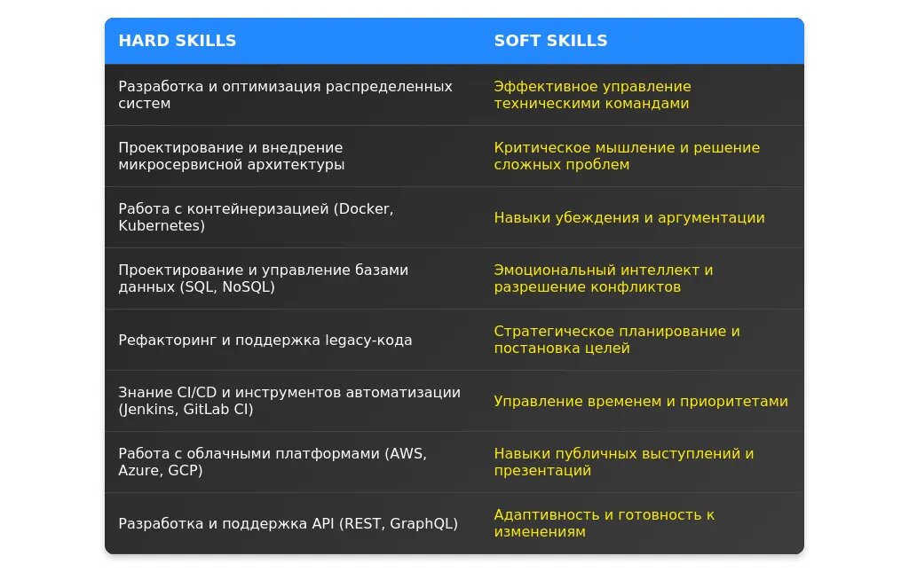 - Сильные стороны: масштаб проектов, управленческие навыки и конкретные результаты.