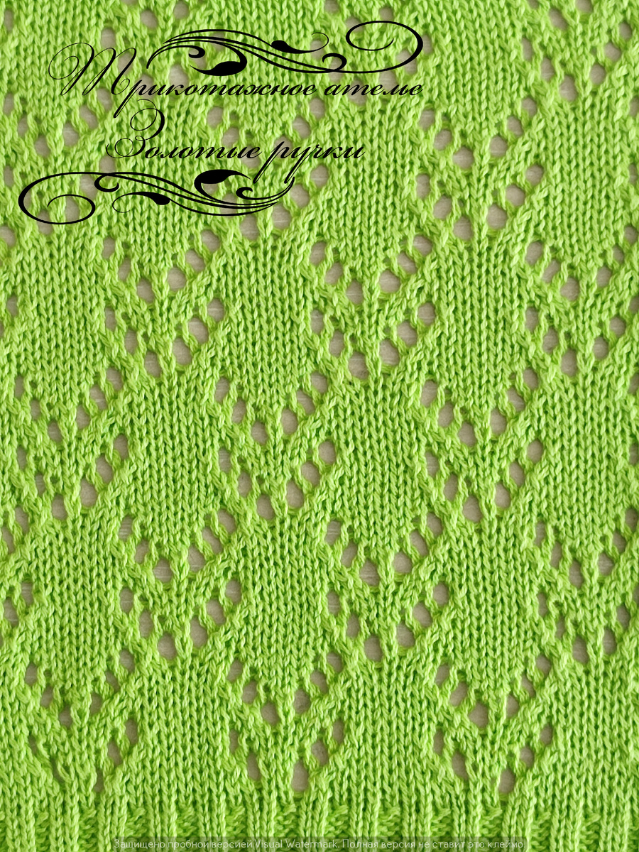 Делюсь своими схемами ажурных узоров для летних кофточек и топов Пришла пора готовиться к летнему солнышку и жаркой погоде. Не секрет, что изысканные ажурные изделия приносят не только практическую пользу в жаркие дни, но и делают женщин более женственными, нежными и романтичными. В статье представлены несколько схем ажурных узоров, которые я часто использую в своем вязании, не потерявшие актуальность и в этом сезоне. Данные схемы ажурных узоров легко можно адаптировать для вязания на любой вязальной машине. №1 Позитивный цвет летней зелени. Этот узор я называю "Две галочки". Образец связан из Индонезийского хлопка 1700м/100г в три сложения А это летняя кофточка, связанная этим узором. Смотрится очень позитивненько и свежо! Ещё один вариант кофточки с коротким рукавом: Это прекрасное болеро связано тоже этим узором: №2 Следующий узор я часто использую для вязания летних беретов и шапочек из хлопка. Для вязания кофточек этот узор слишком откровенен, т.к. имеет много накидов и поэтому
