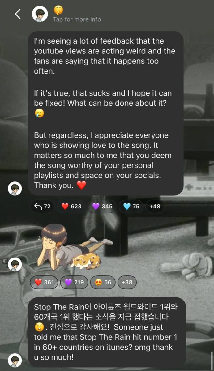 🍀 Табло в Instagram ответил комменту: Клянусь, я смотрела это видео буквально несколько минут назад, и там было 1 367 880 просмотров. Я снова включила видео — и теперь 1 276 636. Я уже подумала, что у меня глюки, но я точно знаю, что видела. Слава богу, я сделала скриншоты. Табло: Я вижу много комментариев о том, что просмотры на YouTube ведут себя странно, и фанаты говорят, что это случается слишком часто. Если это правда, то это отстой, и я надеюсь, что это можно исправить! Что можно с этим сделать? 🥲 Но несмотря ни на что, я очень благодарен всем, кто проявляет любовь к песне. Для меня это очень важно — знать, что вы считаете её достойной быть в ваших личных плейлистах и на ваших страницах в соцсетях. Спасибо вам. ❤️ Огромное спасибо! Кто-то только что сказал мне, что "Stop The Rain" достигла первого места в 60+ странах в iTunes? Боже, спасибо вам огромное! 😲 #RM 🦖🌱[https://dzen.ru/id/5f3ce54ccaeef80d2efd6e05]🌱🦖