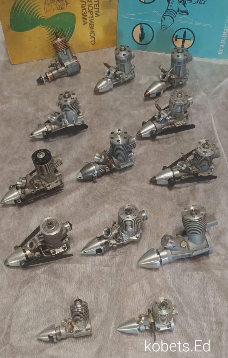 Приветствую!!! Сейчас небольшой обзор микродвигателей для авиамоделей класса F-1-C . Этот класс появился в 30х, с появлением первых микро двс и стал первым спортивным классом моделей с двигателями . Первоначально на модели устанавливали бензиновые десятикубовые двс Браун и АММ . Соревнования проводили на дальность полёта, высоту и продолжительность . Таймером - служил бак, мотор выключался с окончанием топлива. В дальнейшем , с увеличением числа спортсменов, было принято решение ставить на модель таймер от фотоаппарата для уменьшения времени работы двс . В настоящее время появились электронные таймеры. Время работы было ограничено до 7 секунд, сейчас 5секунд. Первые модели взлетали с колес-с земли, сейчас это вертикальный взлёт с рук. Объём двс тоже уменьшили до 2.5 кб.см. а в 90х появился класс кубовых таймерок. Школьники в СССР летали на " полторашках ". С 50х некоторые моделисты начали изготавливать самодельные двс , в настоящее время в основном используются двс зарубежного произво
