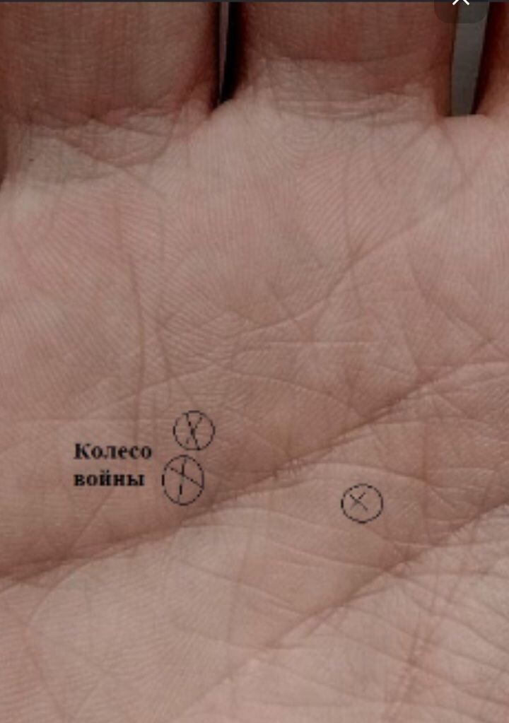 Он выглядит как крест, заключённый в круг. Причем, в зависимости от того, на какой линии он находится, зависит, как эти события повлияют на вашу жизнь. Например, "колесо войны" на линии Сердца, Здоровья, Судьбы говорит о том, что может быть ущерб от этих событий для самого человека (ранения, травма психологическая).