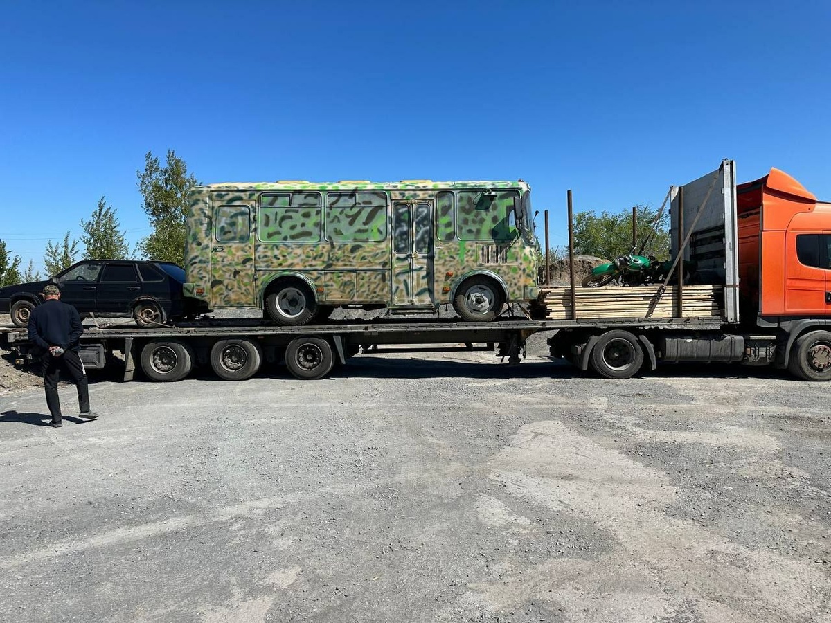 Ее они изготовили на базе списанного школьного автобуса. Волонтеры из Аскинского района восстановили списанный школьный автобус, переделали его под баню и отправили в зону спецоперации. Ценный груз для своих земляков за линию соприкосновения доставил глава Аскинского района Динис Юсупов. Вместе с ним он привез бойцам другие необходимые вещи. В том числе спортивный мотоцикл. Фото администрации Аскинского района.