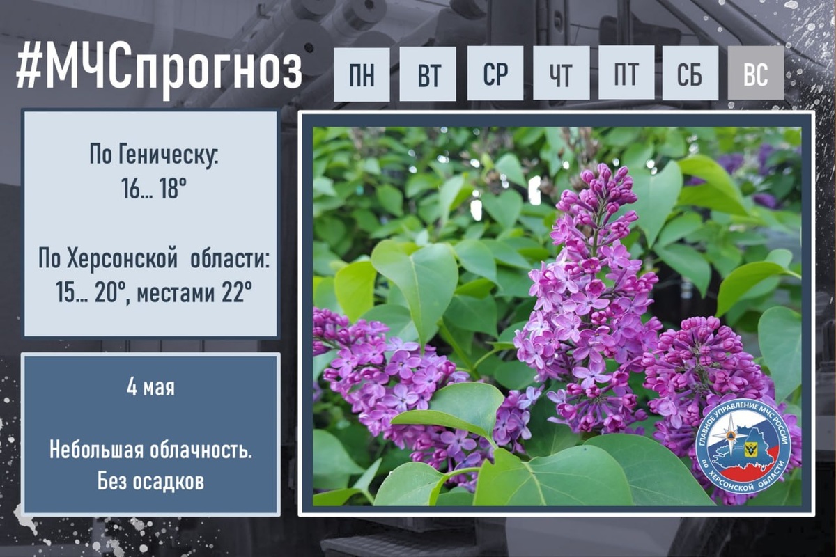 #МЧСпрогноз 👍 мая в городе Геническ: небольшая облачность. Без осадков. Ветер юго-западный и южный 5-10 м/с. Температура воздуха ночью 11...13°, днём 16...18°. По Херсонской области: небольшая облачность. Без осадков. Ветер юго-западный и южный 5-10 м/с, днём местами порывы 12-14 м/с. Температура воздуха ночью 8...13°; днём 15...20°, местами 22°. Местами в южных и юго-восточных районах высокая пожароопасность (4 класс). ☀️ МЧС России желает тебе хорошего дня! В случае чрезвычайной ситуации звони по номеру 🤝🤝🤝