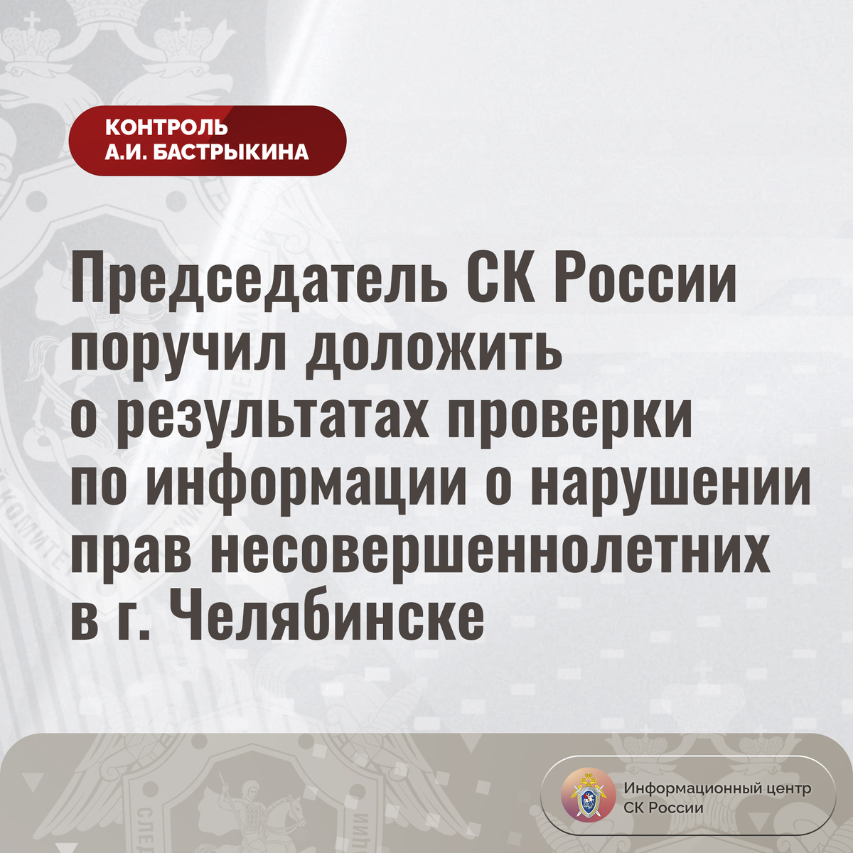 Председатель СК России поручил доложить о результатах проверки по информации о нарушении прав несовершеннолетних в г. Челябинске