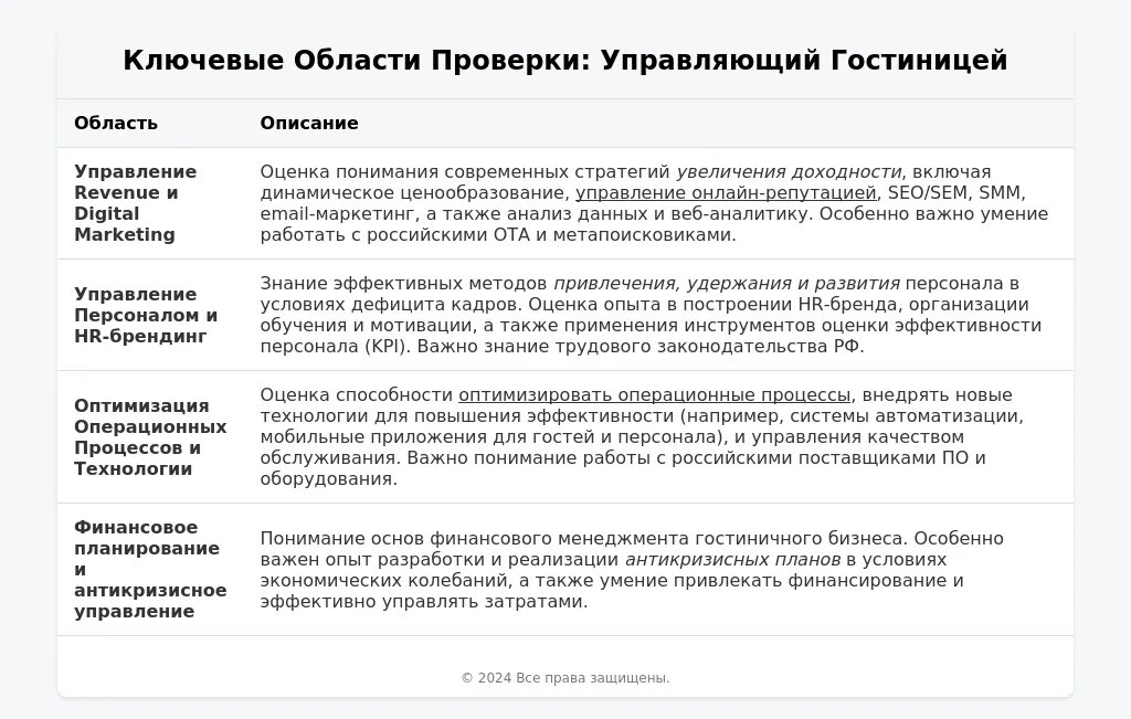 - Ключевые области для проверки знаний:Управление операционной деятельностью гостиницы: ✅ Знание стандартов обслуживания, процедур бронирования, управления персоналом.