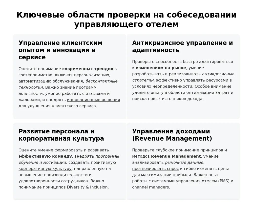 Особое внимание уделяется соответствию корпоративным стандартам и ценностям. - Средний бизнес (частные отели):Более гибкий процесс отбора, акцент на практическом опыте и умении решать конкретные задачи.