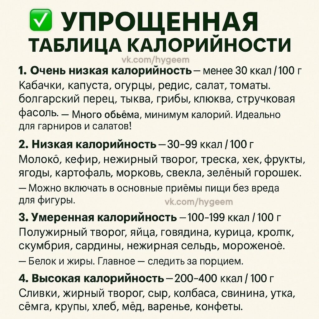 Добрый воскресный день, друзья ! Приветствую вас на канале про похудение и правильное питание . Кто давно меня читает,тот знает,что я худела с веса 132 кг на подсчёте калорий.Да.Это долгий и сложный процесс.Но это того стоит.Сейчас я на поддержании веса .Мой вес 82,700.И он меня вполне устраивает. Многие хотят похудеть ,но очень боятся именно подсчёта калорий,считая это очень сложным. Предлагаю вам выход из этой ситуации . ‼️ Необязательно высчитывать каждую калорию. Достаточно знать, к какой калорийной категории относится продукт. Это реально помогает при снижении веса! ✅ Ловите удобную таблицу — шпаргалку, с которой легко ориентироваться в продуктах: Менее 30 ккал / 100 г Кабачки, капуста (белокочанная, цветная, брокколи), огурцы, редис, салат (латук, руккола), томаты, болгарский перец, тыква, грибы (шампиньоны, вешенки), клюква, стручковая фасоль, спаржа, сельдерей, шпинат, арбуз, лимон. — Много объёма, минимум калорий. Идеально для гарниров, салатов и перекусов! Молоко (о