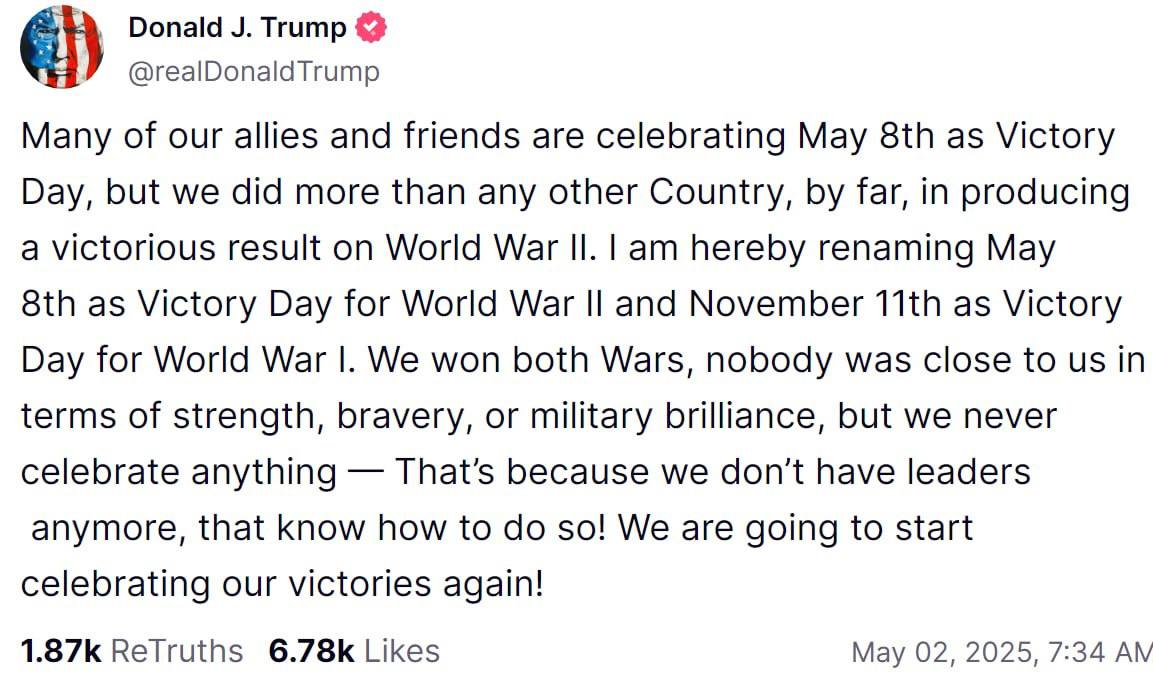 Трамп, оказывается, написал, что США «намного больше других стран» сделали для победы во Второй мировой войне, и объявил 8 мая Днём Победы. Дословно: «Многие наши союзники и друзья отмечают 8 мая как День Победы, но именно мы сделали для победы во Второй мировой войне больше, чем любая другая страна - несравнимо больше. Сегодня я объявляю 8 мая Днем Победы во Второй мировой войне, а 11 ноября - Днем Победы в Первой мировой. Мы победили в обеих войнах, никто даже не приблизился к нам по силе, храбрости и военному мастерству, но мы больше ничего не празднуем - потому что у нас больше нет лидеров, которые умеют это делать! Пришло время снова начать праздновать наши победы!». Недоумеваю, если Вторая мировая война, по версии Трампа, завершилась 8 мая1945 года, кто и зачем 6 и 9 августа 1945-го сбросил атомные бомбы на Хиросиму и Нагасаки? И что за «акт о капитуляции Японии» был подписан 2 сентября1945 года на борту американского линкора «Миссури»?