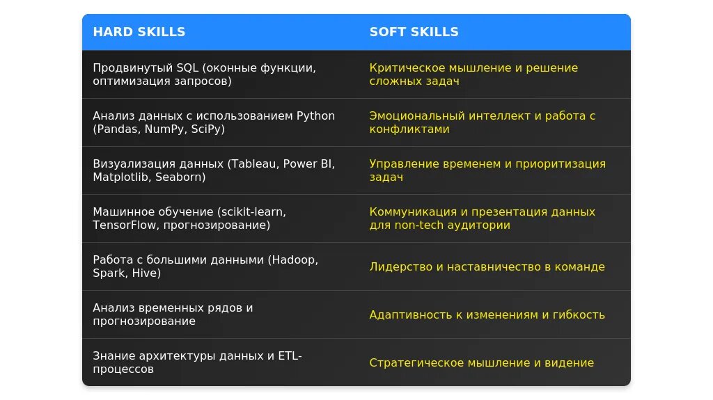 Выделите навыки, которые наиболее важны для вакансии. Например, для старшего аналитика это могут быть: