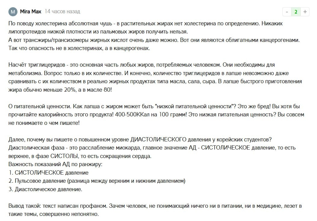 Периодически из NakedScience просят отвечать на профильные вопросы пользователей. Скажем, про всякие дошираки, насколько это вредно-полезно. Первый же коммент - отличная иллюстрация к понятию краниохедральное смещение, про которое я вчера на лекции рассказывал. Я даже скиншот сделал на память, потому что не помню такой плотности факапов на тыщу знаков, что ни строчка - то отливать в бронзе и начищать пастой ГОИ до зеркального блеска. Можно даже поиграть, кто больше блох в комменте найдёт ;)