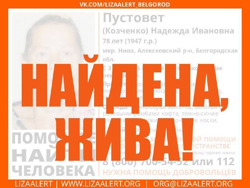 Пропал человек! Пустовет (Козченко) Надежда Ивановна, 79 лет, мкр. Нива, Алексеевский район. С 3 мая 2025 года её местонахождение неизвестно. Если вы обладаете какой-либо информацией о пропавшей, просьба позвонить по номеру телефона горячей линии отряда 88007005452 (бесплатно по РФ) или 112. ❕ Жесть Белгород - подписаться