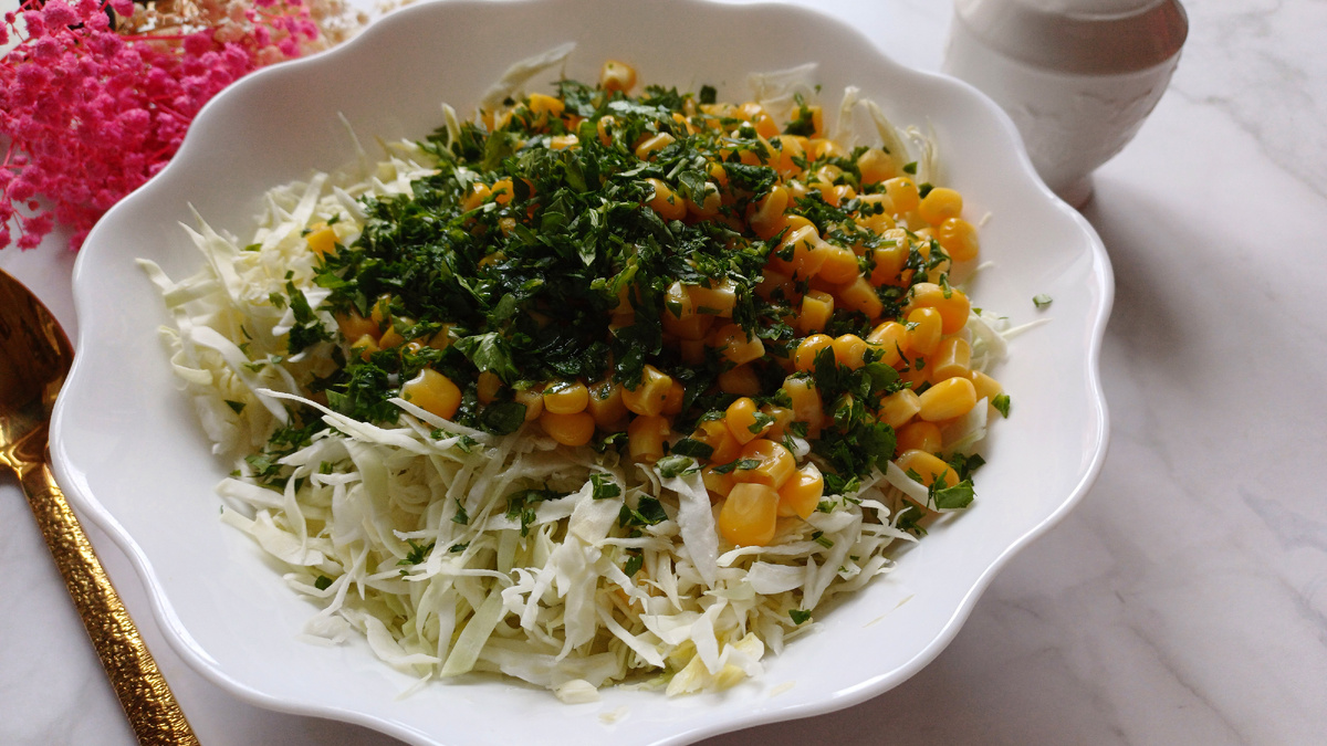 Капуста 100 гр. Кукуруза 1 баночка. Зелень Растительное масло ‐------------------------------------- Предлагаю приготовить очень простой и полезный салат из свежей капусты. Капусту тонко нашинковать , добавить кукурузу и зелень,соль по вкусу.