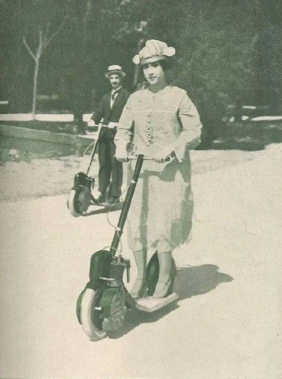 #этоинтересно А вы знали, что нынешние скутеры — это вовсе не ультрасовременные технологии. Более 100 лет назад на улицах больших городов уже вовсю рассекали на этих двухколесных «конях». Как выглядели прадедушки современных скутеров — футуристичное транспортное средство, напоминающее велосипед с мотором. Небольшой бензиновый двигатель, руль, два колеса и платформа для ног. Скорость, конечно, была невысокой, около 30 км/ч, но для того времени это было весьма впечатляюще. На них рассекали дамы в пышных платьях, почтальоны и полицейские. Первые скутеры стали настоящим символом прогресса и предвестниками современных электрических моделей. Фото — Яндекс