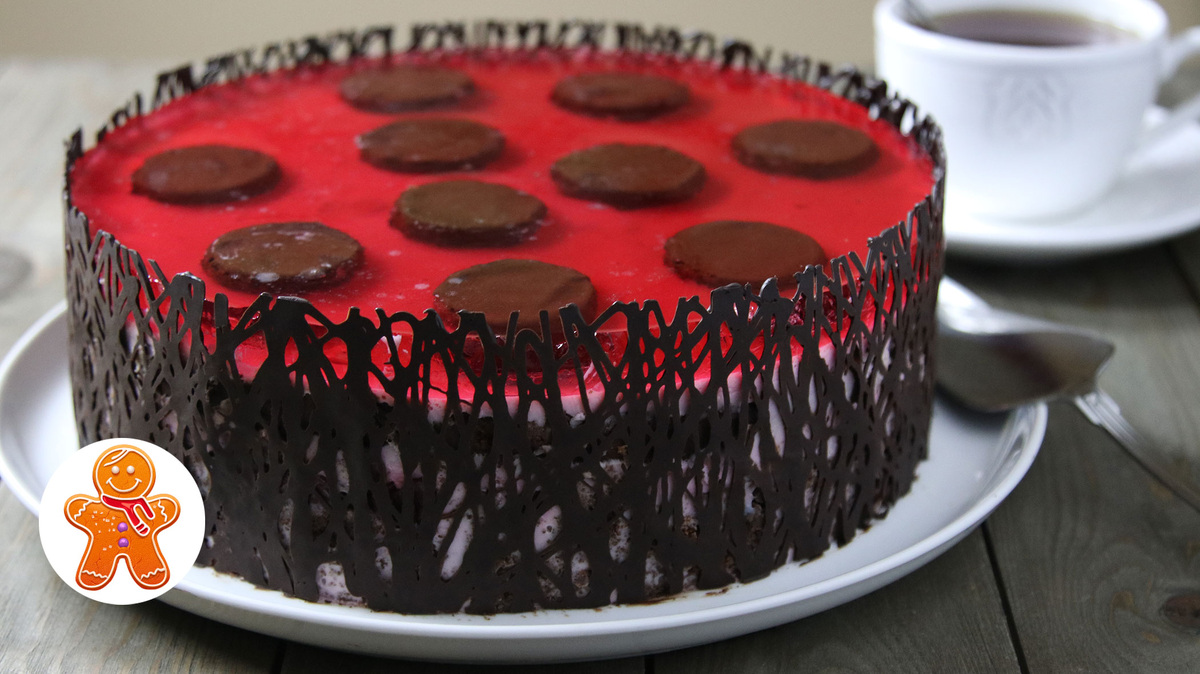 Сверху торт заливаем вишнёвым желе. Можно взять готовое желе из пакетика или приготовить его самостоятельно. Даём желе остыть до комнатной температуры и аккуратно заливаем.