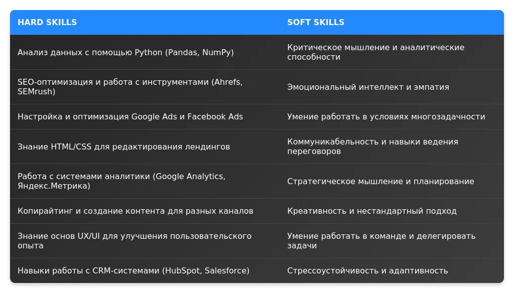 На что делать акцент: базовые технические навыки (Google Analytics, социальные сети) и готовность к обучению.