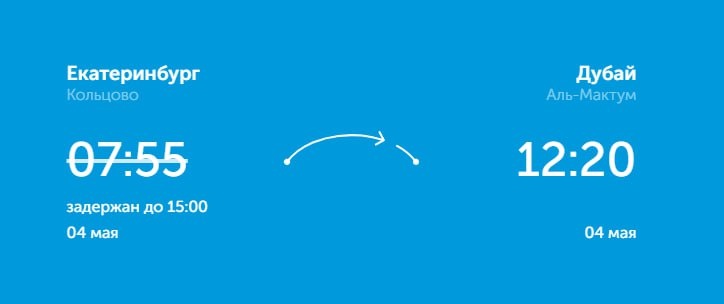 Рейс «Уральских авиалиний» U6-737 из Екатеринбурга в Дубай задерживается на 7 часов. Аэробус должен был вылететь в 7:55, а отправится в 15:00. Как сообщили в авиакомпании, задержка произошла по «производственным причинам», а пассажирам предоставляются все услуги согласно ФАП-82. UPD Самолет вылетел в 15:50 @tourdom
