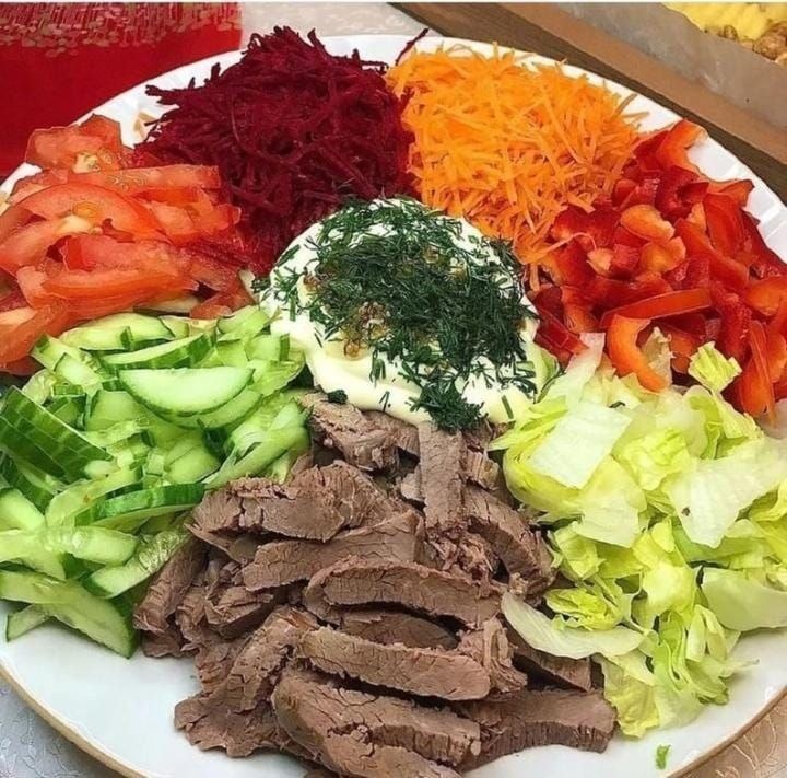 Салат СВЕТОФОР с говядиной и овощами Ингредиенты: - свёкла 50 г - морковь 50 г - болгарский перец, 60 г - огурец, 50 г - пекинская капуста 60 г - мясо ( говядина ) 120 г - томаты 50 г - майонез 70 г - зернистая горчица по желанию - чеснок 1-2 зубчика Приготовление: Говядину отварить до готовности, в бульон добавить душистый перец и лавровый лист,дать покипеть 2-3 минуты и оставить мясо в бульоне на 1-2 часа остывать.( тогда мясо будет сочное и ароматное). Затем мясо нарезать соломкой.Сырую морковь и свёклу натереть на тёрке для корейской морковки.Нарезать пекинскую капусту. Томаты,огурец,болгарский перец порезать соломкой. Выложить все ингредиенты на блюдо раздельно,, в середину положить майонез ( можно майонез + сметана) с зернистой горчицей, чесночком и укропом. Перемешать уже за столом и подсолить. Приятного аппетита!!