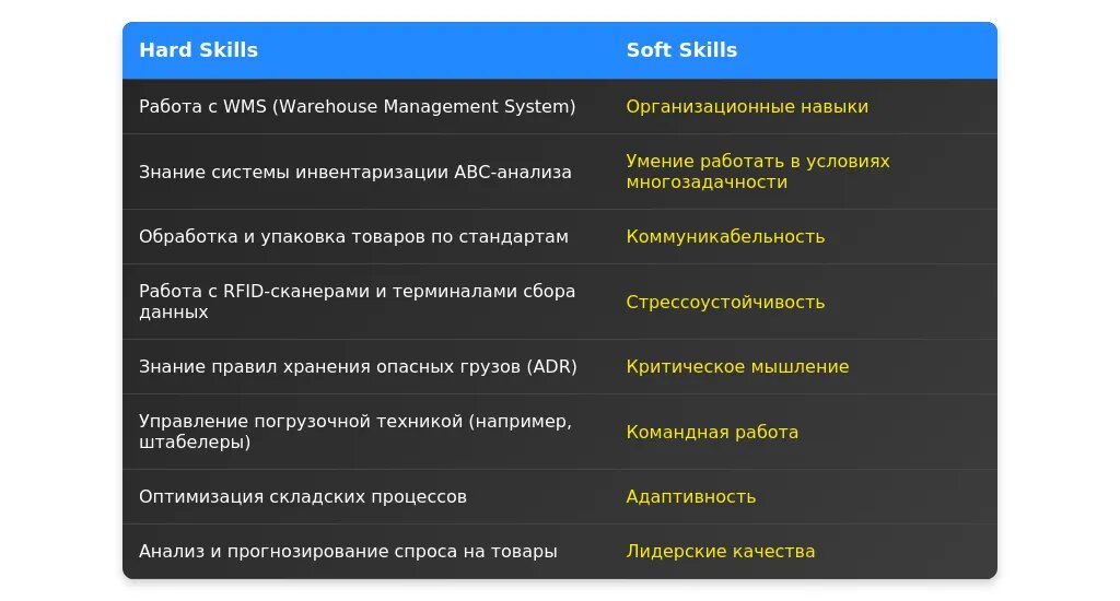 - Есть ли ключевые навыки? (WMS, погрузочная техника и т.д.)