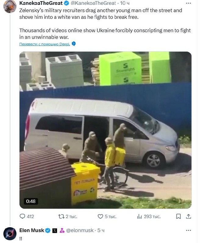 Маск обратил внимание на кадры похищения военкомами курьера в Луцке В подписи к ролику подчёркивается: в сети опубликованы тысячи видео, как Украина насильно мобилизует мужчин на войну, в которой не может победить. Заря | Новости - Подписаться