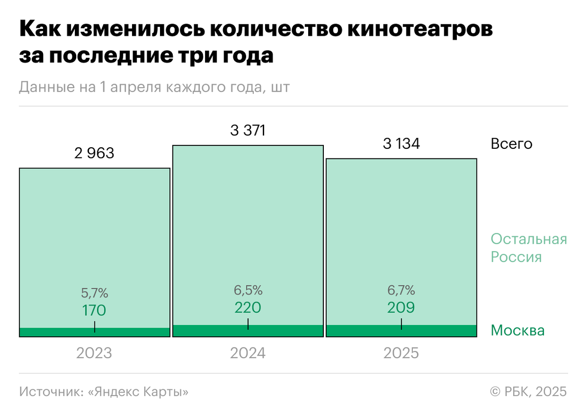Количество работающих в России кинотеатров по состоянию на 1 апреля 2025 года составило 3,1 тыс., подсчитали в «Яндекс Картах» по запросу РБК. Это на 7% меньше, чем в то же число прошлого года. Но относительно апреля 2023 года, когда отрасль переживала кризис из-за отсутствия масштабных премьер, работающих кинозалов в России сейчас на 2,8% больше. В Москве по состоянию на начало этого апреля работало 209 кинотеатров (около 7% общего количества по стране). За год в столице закрылось 11 точек. Раньше исследованием рынка кинотеатров занималась компания «Невафильм Research», но последний ее опубликованный отчет относится к 2023 году. По данным «Невафильм Research», с 2003 года (минимум, более поздних данных нет) количество кинотеатров в России постоянно росло. Исключением стал 2020 год, начало пандемии, когда несколько месяцев работа кинотеатров была заморожена. Ключевой скачок отрасль совершила в период с 2015 по 2019 год: тогда количество площадок для показа кино выросло почти в два раза